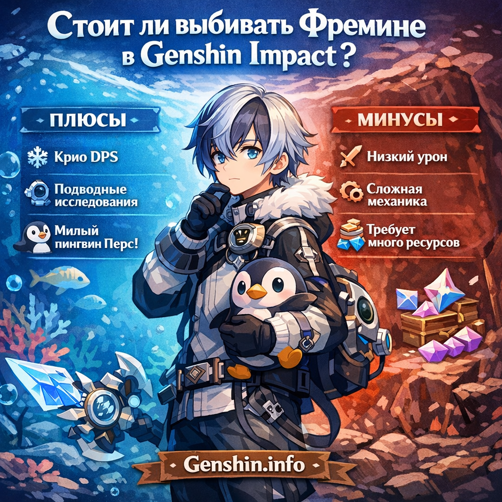 Фремине (Водолаз из Фонтейна) — это Main-DPS (основной урон), который полагается на свою элементальную способность «Давление дрейфующего льда». При активации навыка он входит в состояние Пера, где обычные атаки заряжают шкалу давления. На 4-м уровне он наносит мощный физический удар.