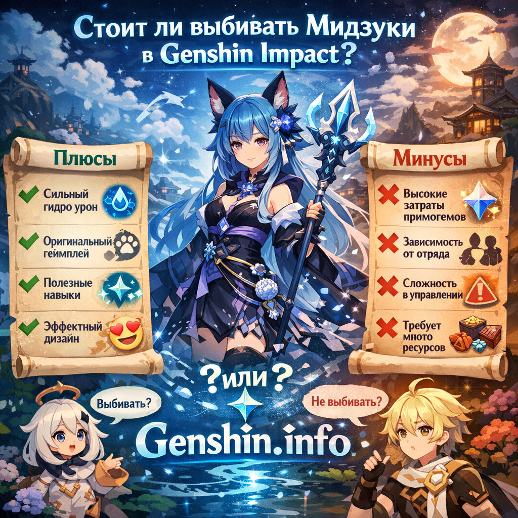 - 1. Нишевая роль: Мидзуки не является универсальным персонажем «на все случаи жизни». Её эффективность сильно зависит от конкретного состава команды и типа контента, который вы проходите;