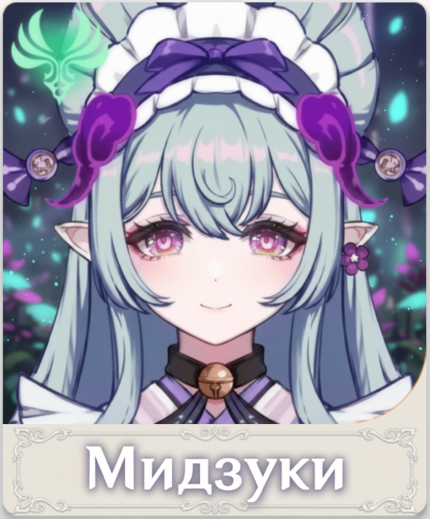 Мидзуки — персонаж родом из Инадзумы, которому для возвышения потребуются материалы из-за моря облаков, а также с босса «Эксцентричная отшельница-спиритуалистка» из Натлана и Бирюза Ваюда, чтобы соответствовать присвоенному ей элементу Анемо.