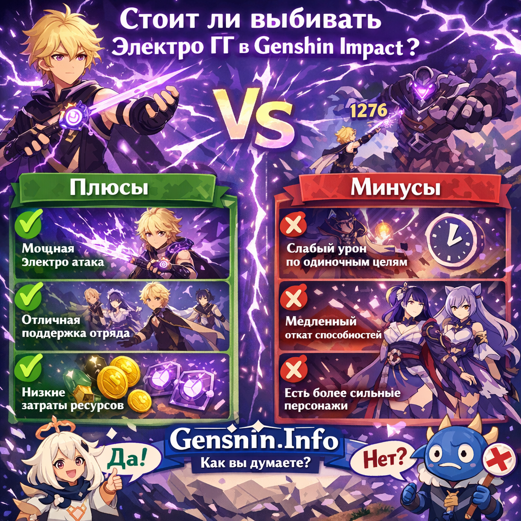- 1. Низкий Личный Урон (По сравнению с другими ГГ): По сравнению с Гео ГГ (который может быть мощным DPS на ранних этапах) или Анемо ГГ (который невероятно увеличивает урон всей команды через сетки Вихрей), Электро ГГ – это в первую очередь Инструмент, а не Боевая Единица. Его личный урон часто уступает урону других четырехзвездочных Электро персонажей (Фишль, Бэйдоу, даже Куки);