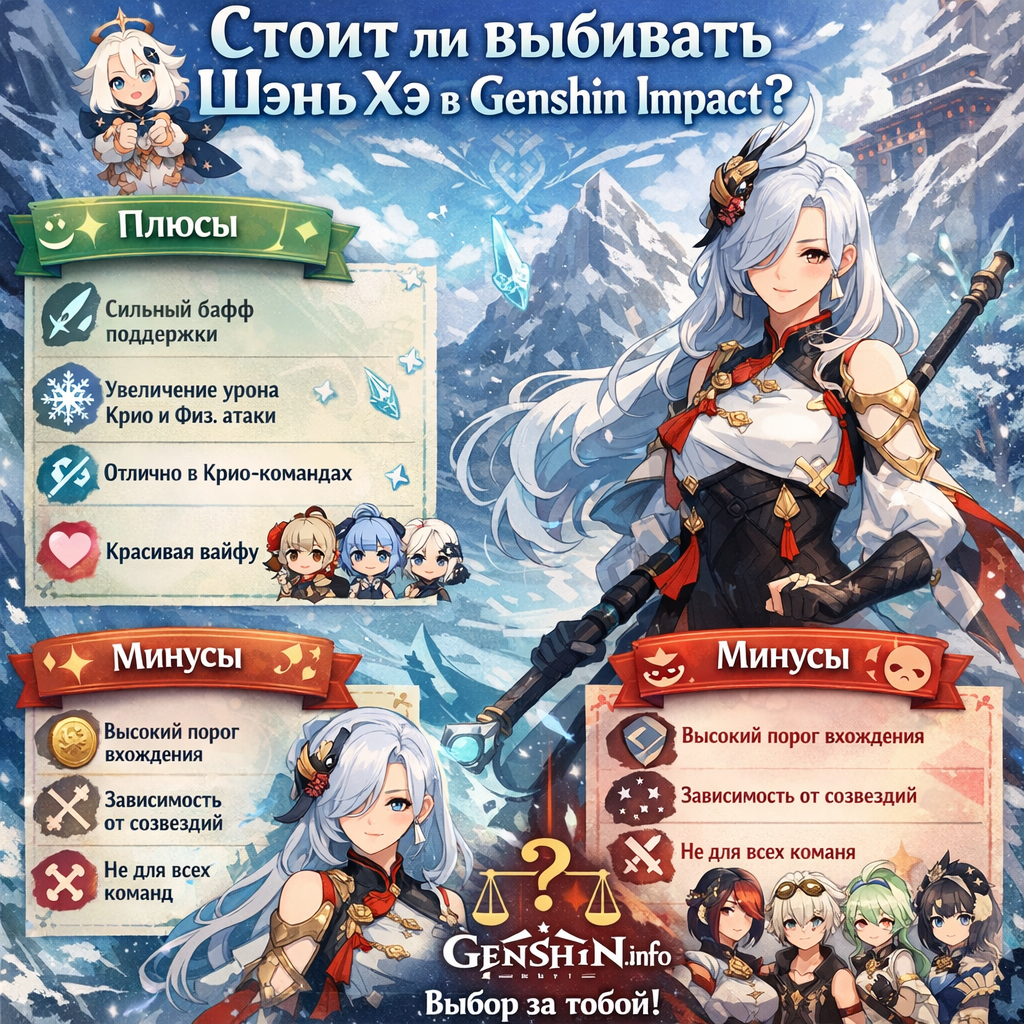- 2. Тем, кто не играет в крио: Если ваши основные команды — это пиро, электр или гео, Шэнь Хэ будет пылиться на полке;